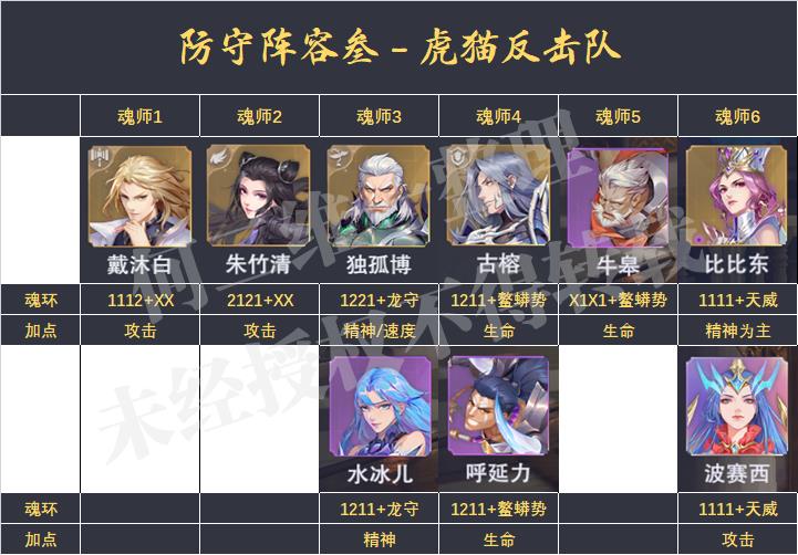 猫的专属魂骨可以让朱竹清具备在自身行动前,敌方每次行动后都可以对敌方进行反击的效果,这个效果配上猫的3-2普攻技能在回合外使用可以对对方造成额外的伤害,同时还可以无视对方的魂环和魂师的被动效果,这个玩意其实大家一眨眼可能有点不太明白厉害在哪,这里维一给大家举个最简单的例子,例如独孤博2-2技能【诛心】的减伤其实就可以理解成一个被动的效果,同时宁荣荣的被动回血效果也是一个被动效果,因此利用此技能的属性,猫在反击普攻敌方的时候基本上就可以无视这些非常烦人的特效,从而可行打出更加不俗的伤害沐白在这个阵容的中的核心影响力便是【协战】和【破甲】,首先如果大家是大佬玩家的话,应该会拥有沐白的右臂专属魂骨,这个魂骨可以让沐白在战斗开始获得至多2回合的【协战】,而且这个协战不仅同样有增伤,且可以100%触发,配合到猫的反击普攻,虎猫双人可以在对方行动之后同时给予对方普攻打击,这个伤害持续起来还是比较可观的;此外沐白的1-1技能给予的【破甲】威胁大家应该也是有目共睹了,配合到猫的不断攻击还能起到更大的效果此外这个阵容的其余魂师搭配其实非常的多元化,例如上图中的主力和备选魂师大家可以参考,甚至是焱、唐月华、宁风致等魂师也是可以作为备选之一的,因此大家可以根据自身魂师的练度来进行调配,总之猫虎反击队本来也是一个更加适合于高练度玩家的防守阵容,其综合的胜率亦是非常不错的