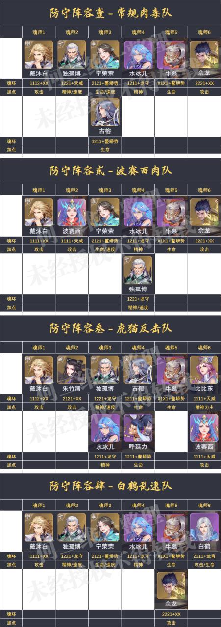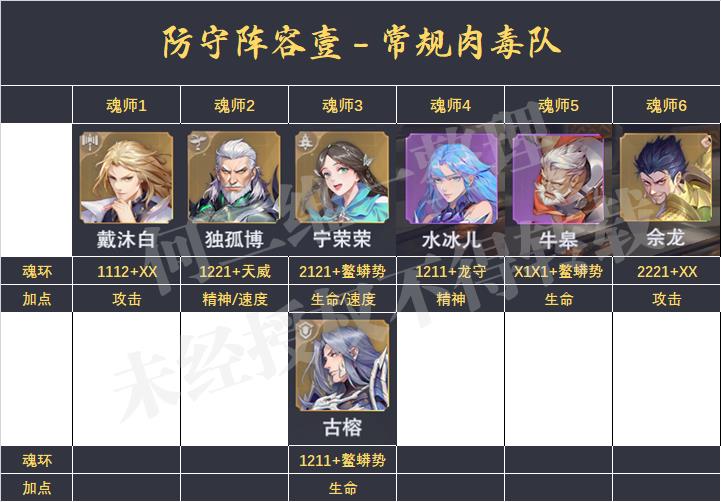首先是最佳版的常规防守阵容,肉毒队的部署,实际情况的队伍和魂环、加点部署如上图图所示,其中维一对第5、6魂环的搭配只会写出特别重要的1个,剩下的那个大家按照平时的常规搭配即可,另外特定魂师的备用选方案维一也在上图中进行了标注,大家可以适当进行调换,这里另外此队伍稍作补充: