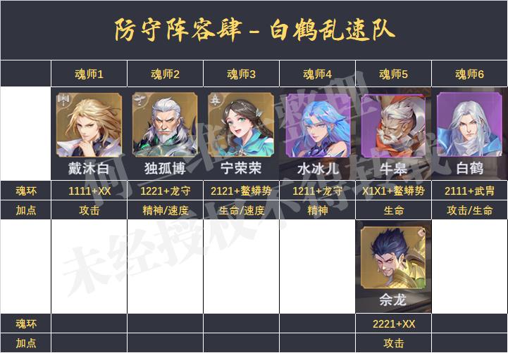 今天的最后一个防守阵容给大家带来的是有关白鹤+水冰儿的乱速队伍,这个队伍其实大致的逻辑和之前的队伍也比较类似,其中的关键就是白鹤的乱速功能,利用这点不管我们是否拿到了一速都可以在行动条上做更多的文章,不过这个阵容的缺陷也非常明显,对方可以利用唐昊或者比比东来控制或破掉白鹤的被动,不过好在此队伍还有一个水冰儿来保底,所以整体的战斗强度还是有的,另外大家如果追击的是反击流速攻的话,可以把犀牛给换成高练度的佘龙,此时白鹤就可以链接次级的敏攻系魂师,彻底化身为工具人,不过此时白鹤的生存能力就要打一个大大的问号,怎么抉择就看大家自己的理解了。