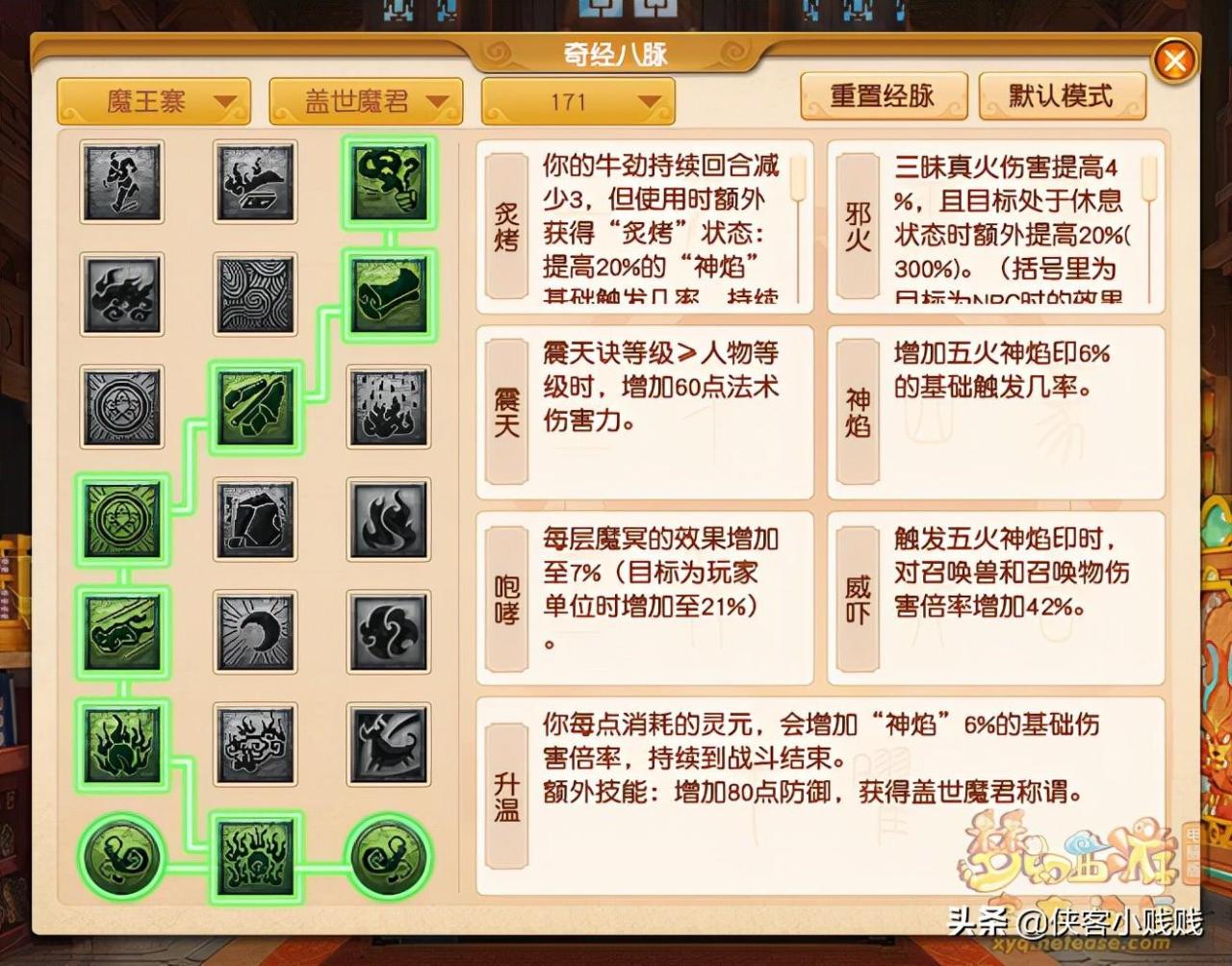 盖世魔君流派最大的属性是强化了“牛劲”的效果,经脉点法推荐为3321112,这样的点法主要是为了强化其输出属性。由于此流派的定位通常用于挑战玩法或PK玩法,经常会用到“三昧真火”,点出第六排【威吓】后,可以配合神器技能很好地提高清宠、清幻魔能力,使得该流派在战术方面拥有了较高的开发价值。