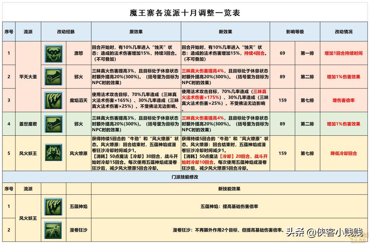 总的来说,魔王寨三个流派均在本次改动中获得了增强,其中“平天大圣”的增强效果最为明显。在限定条件下,“平天大圣”流派的伤害上限甚至可以在罗汉状态下秒出不错的数据。相信在这波改动后,可能会出现携带PT+MW体系的双法或者三攻队伍。本文仅代表个人观点,不代表游戏或官方论坛立场。