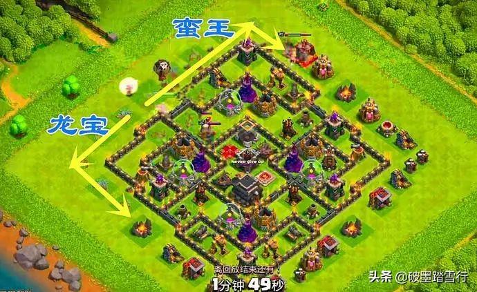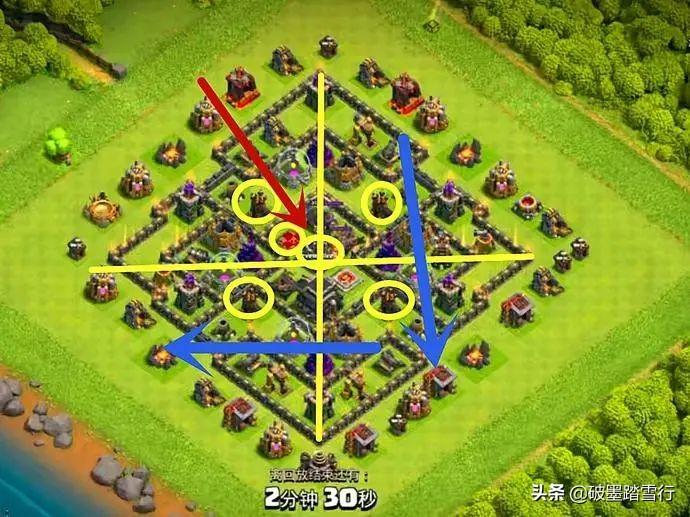这个阵型也算是9本的经典阵型了,防空导弹的间隔很大,并且在阵型的第二层,女王和部落城堡居中,那么想要“天女”可行进入到阵型里面,我们首先就要清理“城墙”外面的建筑,也就是我们所说的“清边”只有这样“女王”才会往阵型里面走,不至于被“城墙”外面的建筑建议发生走偏的情况,小伙伴们一定要记住,不管你使用任何“流派”或者是进攻任何阵型,只要想让“英雄”进入到阵型的核心“清边”和“断边”都是最基础最实用的步骤,一定要熟练掌握。