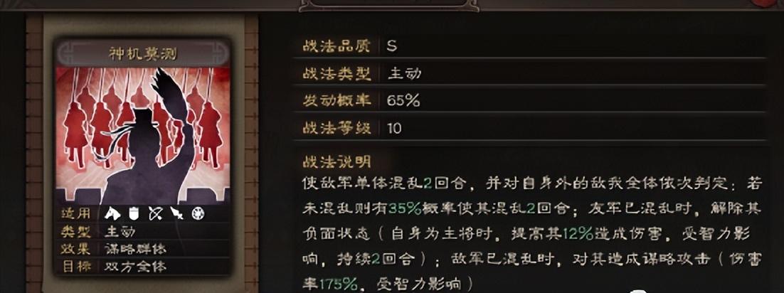 神机配伪书双控场效果,贾诩超强的高概率单体混乱,并且还有概率对自身以外的敌我全军判定,运气好可以8回合混乱致死!