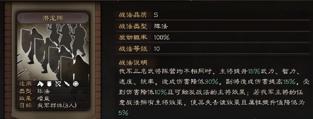 潜龙阵作为队伍的核心战法,可行给主将思维带来不错的提升,让左慈得了很大的提升,众所周知左慈兵种适性属性上是非常低的,潜龙可以完美的补上这一短板。造成伤害降低的效果可以忽略不计毕竟左慈是纯辅助又不用他打伤害,还有一个给副将的增伤效果也非常不错,并且还有10%的概率让双C同事触发主将的效果。