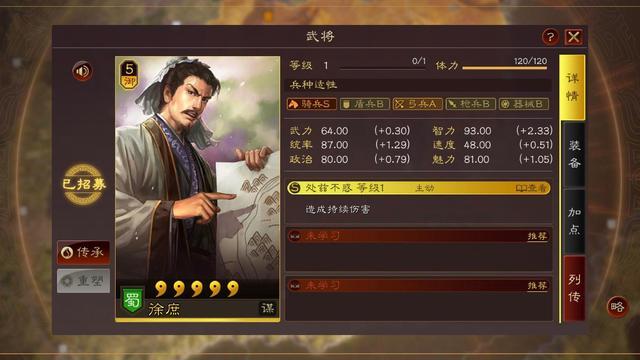 关于徐庶的属性面板很简单,智力很高,统帅也合格。作为一个五星智力型武将智力没有90都不好意思拿出来混。