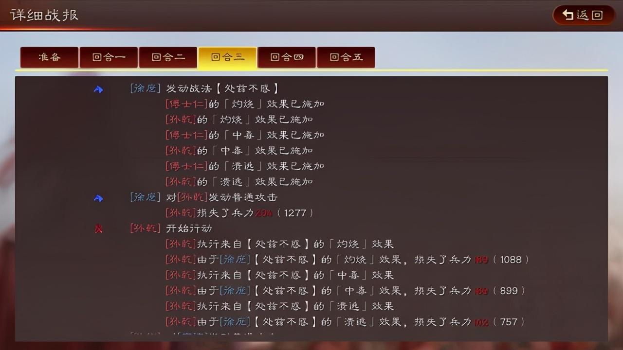 如上图战报的状态施加效果,对两个武将施加两个智力伤害一个武力伤害,在战法执行的2个汇合内总计有12次伤害输出。
