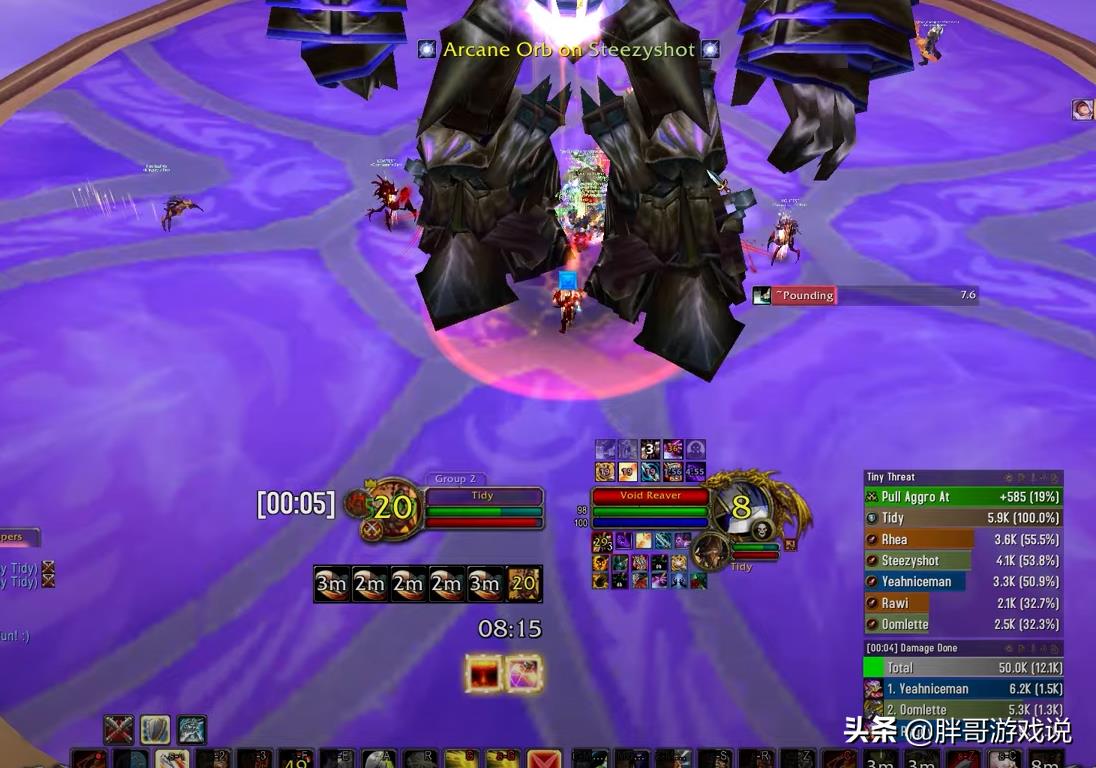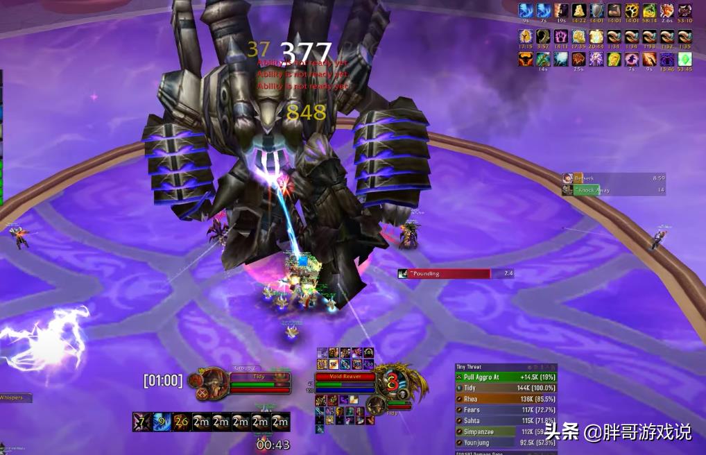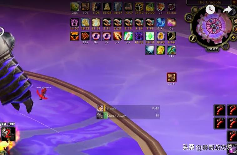 整场战斗都保持在防御姿态中打伤害,全程只按一个键位——英勇打击,连雷霆一击和挫志怒吼都是由另外一名武器战士完成的,也就是BOSS血量下降到20%之后,才放弃了英勇打击,选择了狂暴姿态使用斩杀技能。