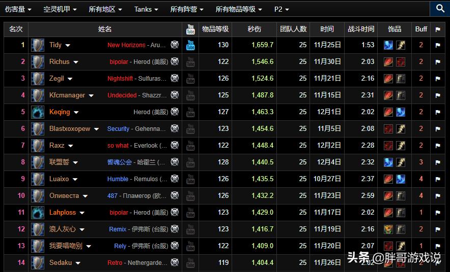 上面是风暴要塞空灵机甲坦克职业排名,可以看到排名第一的防战打出了1659的秒伤。这个秒伤在WCL的DPS榜单中并不算太高,但是对于普通玩家来说,这个秒伤已经可以在野团中排名比较靠前了。