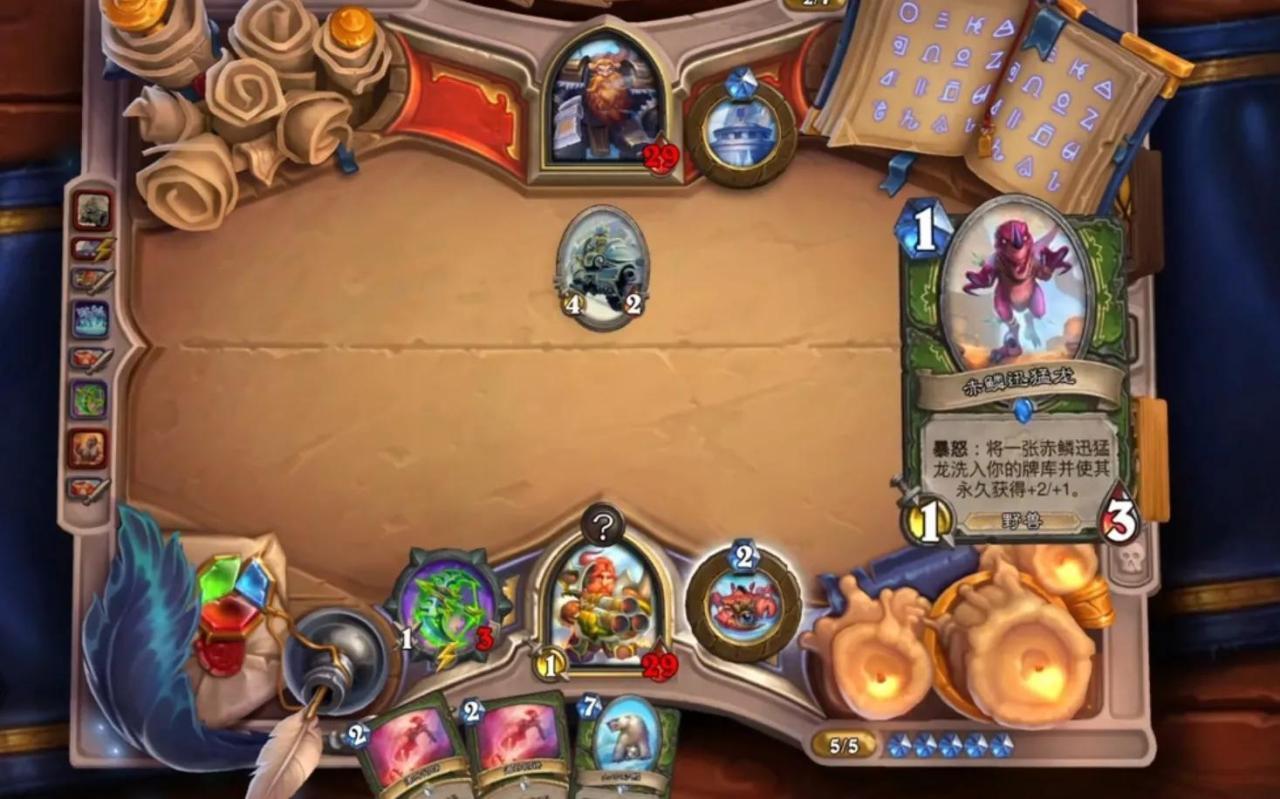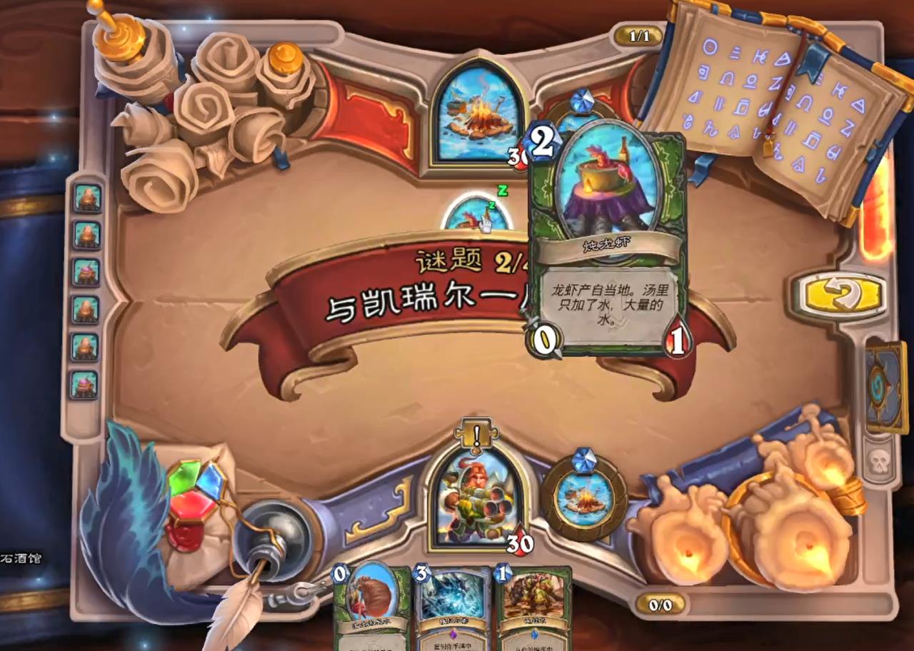 第三道,火热海鲜浓汤:因为是高配版炖龙虾,所以需要两份龙虾,先用科多班恩过牌,再用两费的召唤宠物过一张0费的奥特兰克龙虾,把奥特兰克龙虾上场后用杀戮杀掉科多班恩,随后把其他食材上场就行,印记是干扰项,没有用。