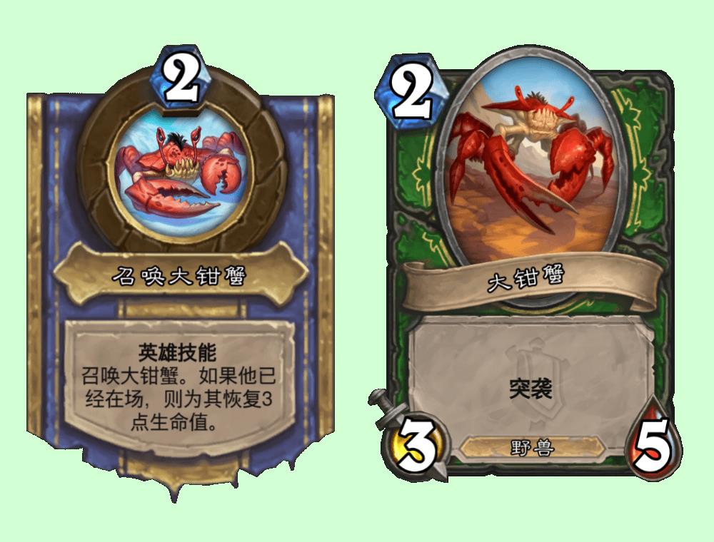 这次佣兵之书中,塔维什·雷矛的卡组基本上都是奥秘+野兽体系,而且奥秘带得还挺杂的,军备宝箱冰霜冰冻爆炸什么的清风都见到过;技能都是召唤可以突袭的大钳蟹,如果大钳蟹在场则恢复他的生命值,异同在于大钳蟹的属性值以及奶量。不过很多关卡塔维什并不靠的技能和卡组获胜,而是靠他的佣兵伙伴们,这些之后会提到。