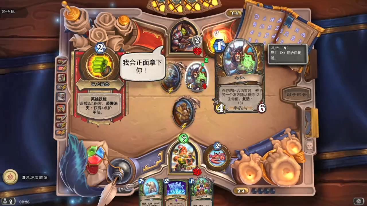 从深铁矿洞出来后,联盟小队遇上了洛卡拉率领的部落小队。虽然说部落小队比联盟小队少一个人,但是实力毫不逊色,对方的古夫跟布鲁坎效果都很强,古夫复活后要尽快击杀,经常给嘲讽随从加生命值真的很蛋疼;布鲁坎暴怒效果触发后非必要情况下就不要打死他了,我方场上尽量要让大怪存活下来,到后期洛卡拉疯狂用技能打你脸,我方又没有回血策略,感觉对面才是猎人……