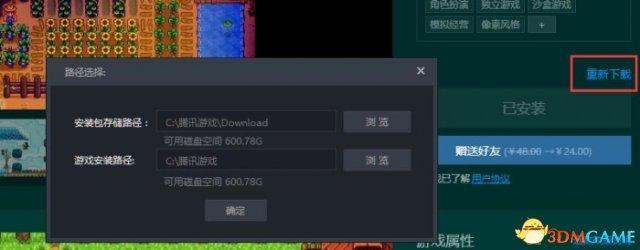 2、删掉电脑上已经部署的其他版本的星露谷物语后,点开TGP星露谷物语的专区,如下图所示,再点击“重新下载”即可。
