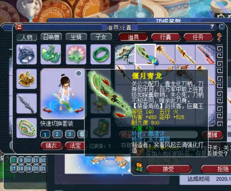 这位玩家给自己鉴定140武器的时候直接就弹出了逆天的双蓝字,然后就鉴定出来了上面的这一把140级的刀,这把140级的刀带的晶清诀和永不磨损特效,如果这把武器的双加增加的是敏捷、体质、耐力等属性,这件装备绝对很值钱,如果是那种双加,这件装备卖两三万都没有任何的问题,但是现在这件装备就有一点尴尬,因为它增加的是力量,力量属性给辅助门派的玩家使用就有点浪费了。