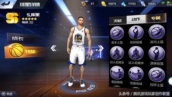 库里动作:库里的动作有11个,其中传球技能包括假投真传、空接传球,这两个是控球后卫必备的动作,另外库里拥有3个过人技能,分别为过人后跨步、过人后撤步、背后换手运球,适合异同情况下进行使用,可以帮助库里摆脱防守球员。虽然库里拥有高手上篮、拉杆上篮等动作,但是不推荐突入篮下进行得分。