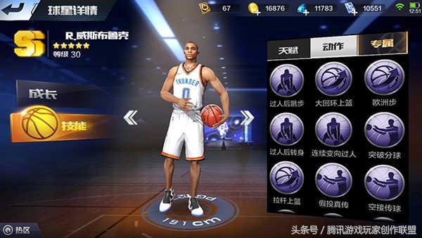 威斯布鲁克动作:威斯布鲁克的动作有12个,其中传球技能有突破分球、空接传球、假投真传3个,另外威斯布鲁克的突破动作非常丰富,包括了过人后跳步、过人后转身、连续变向过人,丰富的突破动作可以让威斯布鲁克不依靠队友挡拆,即可单人完成突破。