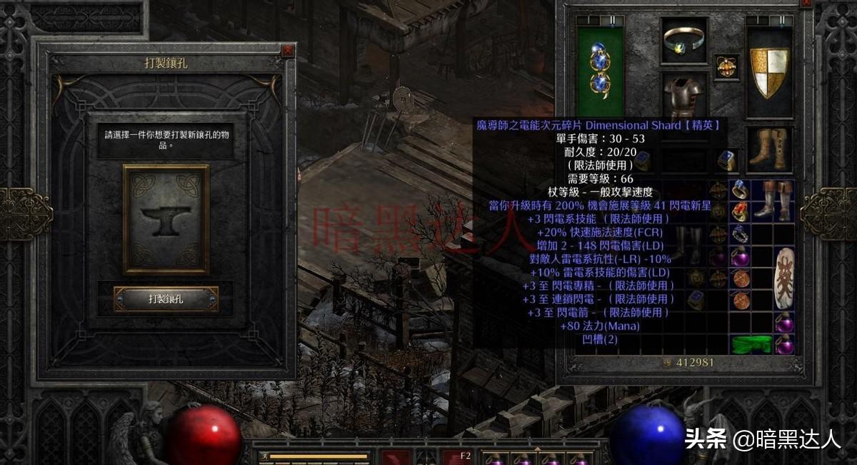 暗黑破坏神2重置版可存在孔数的装备有武器(除标枪、飞斧等投掷类)、衣服、头盔和盾牌这四个部位,装备如果生掉落就带有一定孔数,则无法为其再次打孔,而无孔的装备可根据其属性选择赫拉迪克方块公式打孔或者第五幕第一个任务打孔(重制版暂不介绍用乔丹之石打孔,代价太高也没必要)。