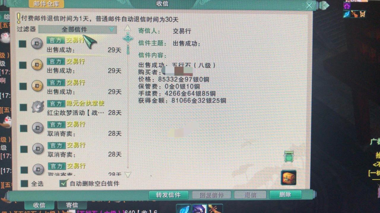 卖掉了之后我又摆了3颗8.5w的,为什么摆3颗,因为武器镶嵌就是需要3颗,如果卖掉后我将继续涨价。然后过了几天,3颗全部出售。
