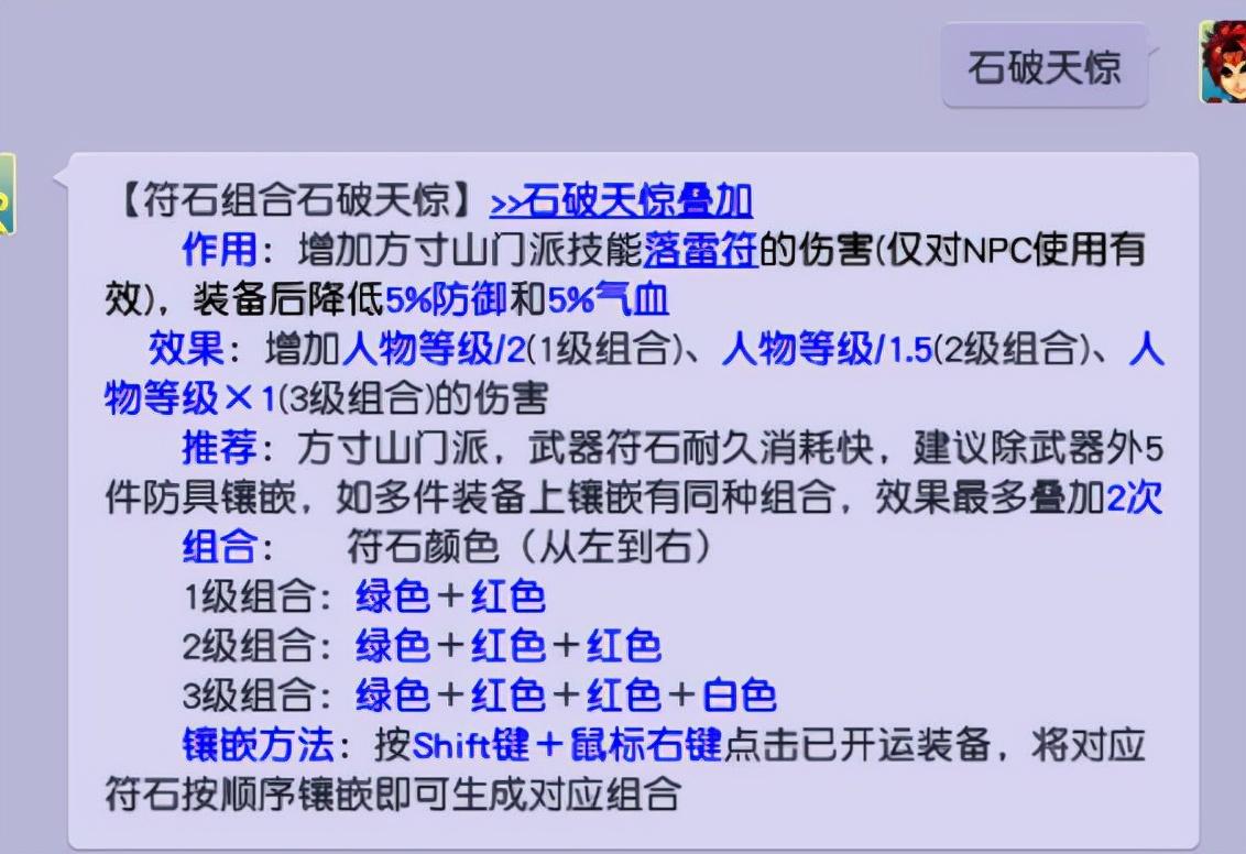 然后是有一些类似上面的四孔,能极大提升门派技能输出的符石组合。比如方寸山的石破天惊、化生寺的福泽天下、五庄的烟雨飘摇等等,这类组合同上,也是能叠加两次,都要带满两件四孔的。