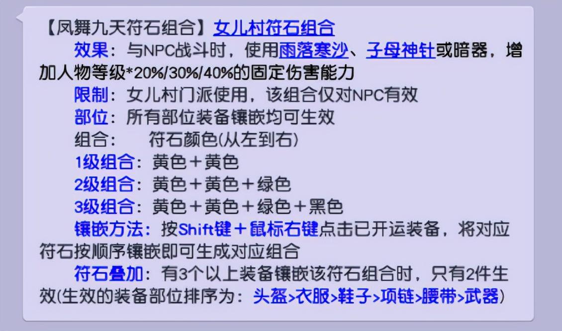 首先五开中固伤是绝对的主流,就算五门五开也会至少带一个固伤。所有的固伤都有对应的增加技能输出的符石。比如女儿村的凤舞九天、无底洞的销魂蚀骨、普陀的行云流水等等,这类组合能极大的提升输出,最大是3级组合,要100级才能开四孔装备使用,最多叠加两件。因此所有的固伤至少要带上两件100级装备开四孔打这个组合。