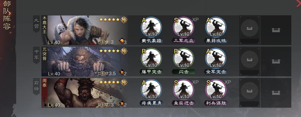 木鹿兀突骨周泰这队是专门打砍王这类依靠指挥战法增伤的队伍