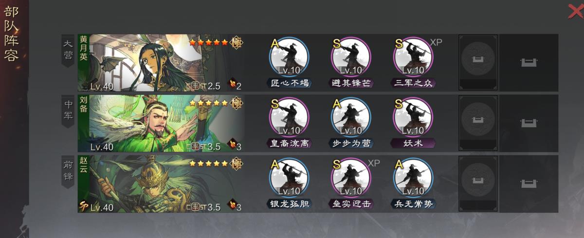 肉步和月英蜀步都可以依靠减伤战法和高额回复量抗住砍王前三回合的攻势,前锋带上垒实,可行援护友军,同时月英稳定输出,刘备带上妖术能让对面自己砍自己,可以说这队就靠着肉抗伤害,输出靠月英和妖术,对付没有回复效果的砍王效果很好。