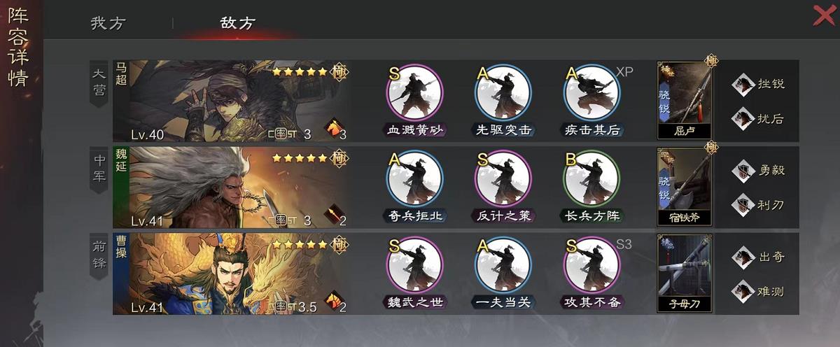 砍王的输出来源于马超的普攻和追击以及魏延的主战法,拥有超强的爆发,以及魏延对敌方中军及大营的指挥战法伤害。
