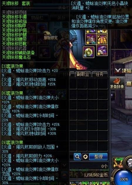 天禄除邪套,简称*蟆套(蟾蜍套)主加火遁-蟾蜍油炎弹,将油炎弹的伤害以及范围极大的进行提升。配合超大范围的70SS怒火*蟆可行造成超高的伤害。九件套搭配不仅是增加了油炎弹的攻击力和减少冷却时间,而且增加了油炎弹的攻击范围和大小。油炎弹的冷却时间是26.2s,九件套下油炎弹的冷却时间减少一半,攻击力增加了35%。