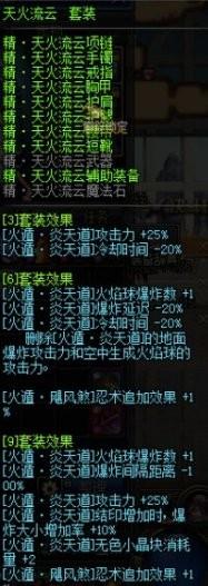 天火流云套是当时很多忍者玩家选择的异界套,这一套异界套主要是加强火遁·炎天道,搭配这一套最好的武器是是火光冲天·灭,没有火光冲天·灭的玩家也可以选择了85传说武器来作为替代的武器。