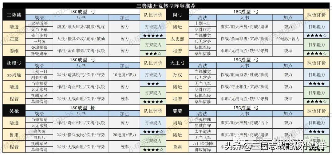 根据开荒可选择的兵种(方便区分土地难度),此处为主公们推荐三类队伍的开荒体系,以及转型队伍。