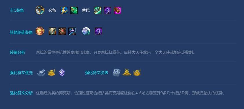 这里核心C位是敖兴,敖兴必配装备有:大天使之杖+朔极之矛,最后一个备选夜之锋刃或者珠光护手;其次是防御型泰拉:泰拉必配装备有:石像鬼石板甲+荆棘背心+巨龙之爪,防御堆满。最后一个就是索拉卡了,相对其他英雄,优先给索拉卡配装备:夜之锋刃+朔极之矛,其他英雄就捡剩下的随便搭,有条件的可以搭满。