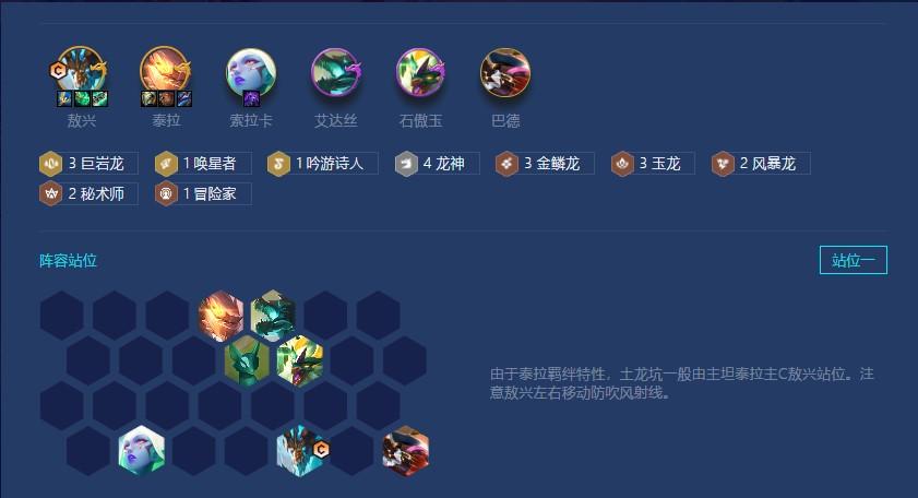 最后的顶级成形阵容是:泰拉+艾达丝+石傲玉+索拉卡+敖兴+巴德对应的羁绊是:4龙神+3金鳞龙+3玉龙+3巨岩龙+2风暴龙+2秘术师+1唤星者+1吟游诗人+1冒险家