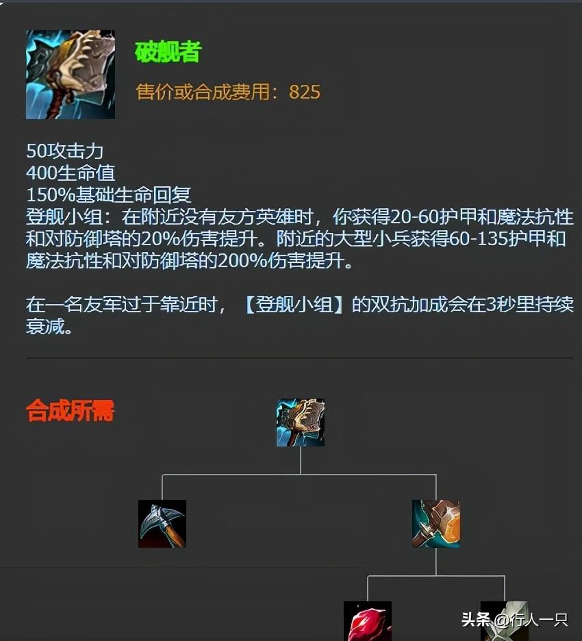 破舰者的效果自不多说,出来的时候让约里克带着一家六口崛起了一段时间,输出现在又不见人影了。它配合兵线能对防御塔造成极为有效的破坏,尤其在搭配大型小兵(跑车和超级兵)时,军民一体了属于是。