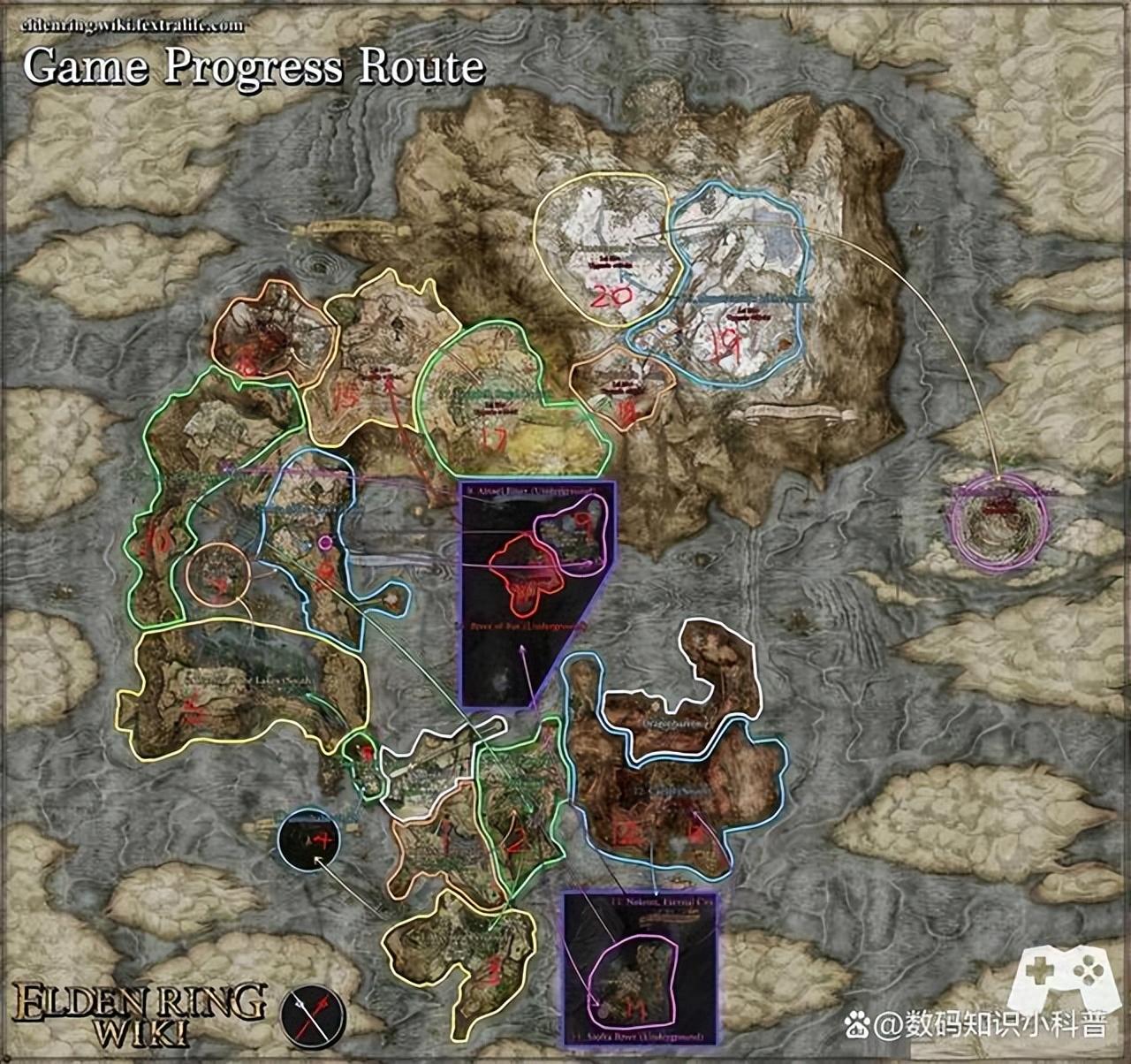 1.出了出生点以后,优先到关卡前方找到梅琳娜拿马,再回到艾蕾教堂菈妮拿招魂铃,这样就有了交通工具和防身物,接着就可以正式开始攻略交界地,这里也推荐给大家一张等级探索顺序地图,供各位玩家详细了解。