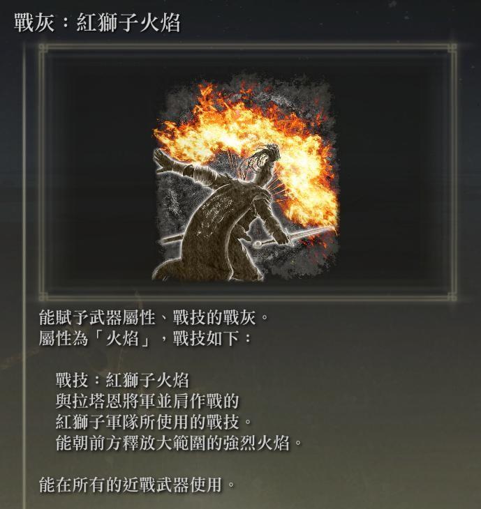 红狮子火焰可以搭配祷告-黑焰刀刃,让红狮子火焰附带黑焰效果。
