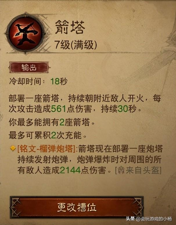 -箭塔,有3个影响力,①用于吸引野怪仇恨;②保持刷连击的节奏;③提供火力援助。这里笔者倒是没有特别使用宝石或者装备去提升他的存活时间,属性选择的是变成榴弹炮塔,提供更多伤害和AOE。副本的BOSS会优先攻击箭塔,这样猎魔人会有更多的输出空间以及跑位时间。打火男8人副本可以作为伤害提供。