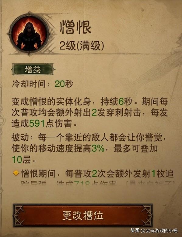 -憎恨,作为猎魔人必须带的技能。能短时间能提供穿透能力的射击效果,且提高可叠加最高30%移速。适用于AOE打怪以及BOSS副本拉扯。
