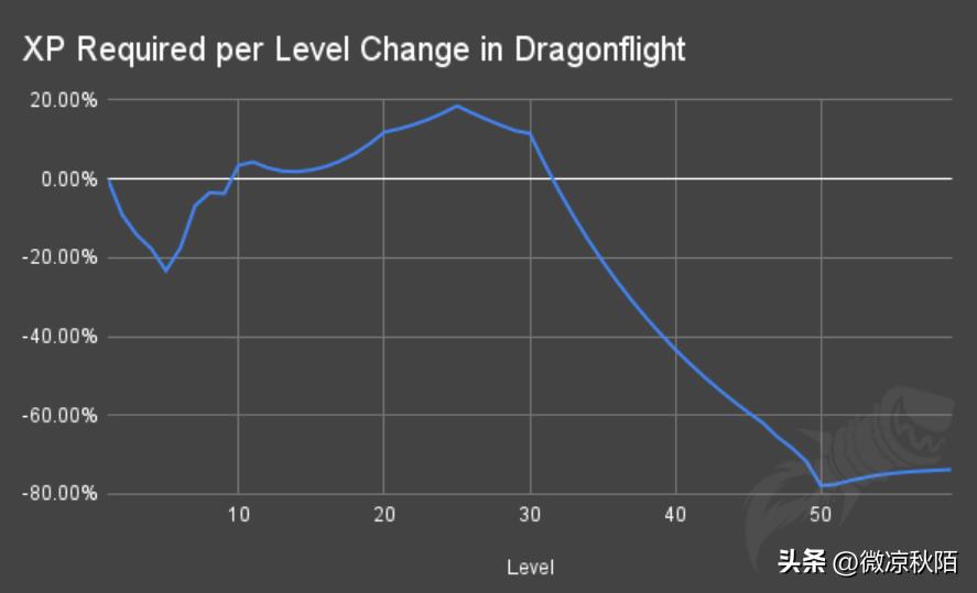 从32级开始,巨龙版本对比旧版的升级效率,就会有明显的速度上的提升,因为10.0版本大幅度地减少了每级的升级经验。在32到50级这个阶段,每级以叠加的策略减少5%左右的经验,50级所需的升级经验直接少了78%。也就是当角色达到32级,升级速度就会直接起飞,这样就能做到在克罗米时间线里面用一个资料片就轻松升到60级,然后进入巨龙版本的新等级阶段。