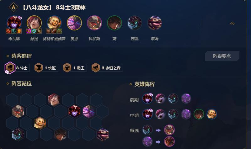 因为霸宰三国这个套路难度较高,所以再推荐一款以瑟提为核心的套路。因为瑟提是五费的卡,所以想要拿到,必须要进入到后期。但是想进入到后期,难度还是挺大的。所以这一次给出的阵容是八斗龙女,前期好龙女输出,但是玩家也要攒瑟提装备。依旧是暴击拳套、无尽、科技枪。前期靠龙女输出保证血量,靠斗士肉耗。后期瑟提一个技能清屏幕,游戏体验极佳!