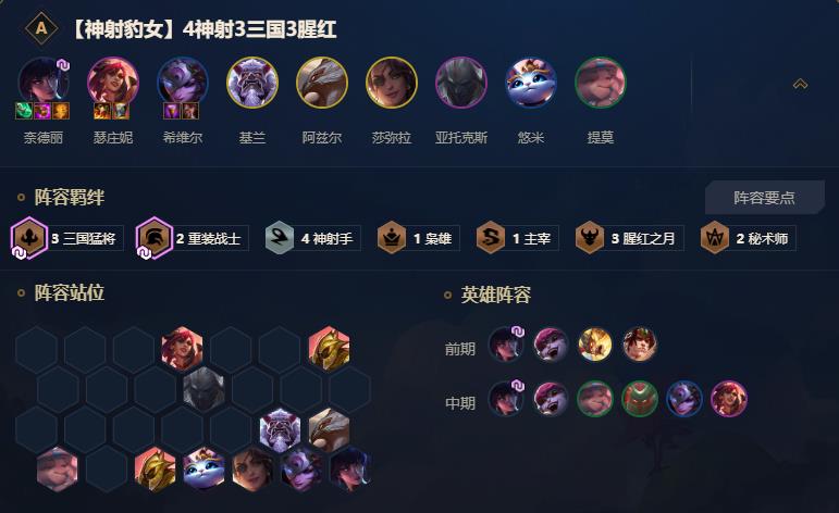 首先说神射豹女的思路,顾名思义是前期刷出三星三国天选豹女,以豹女为主C进行游戏。这套阵容在官方眼里并非是S级套路,但是还是很有趣的。如果比较胡的话,吃鸡没问题。哪怕是胡不了,恰烂分还是可以做的。而这个套路的核心豹女出装,就非常重要了。豹女主要依靠技能打输出,想要玩好这套阵容,就要把豹女的装备出好。