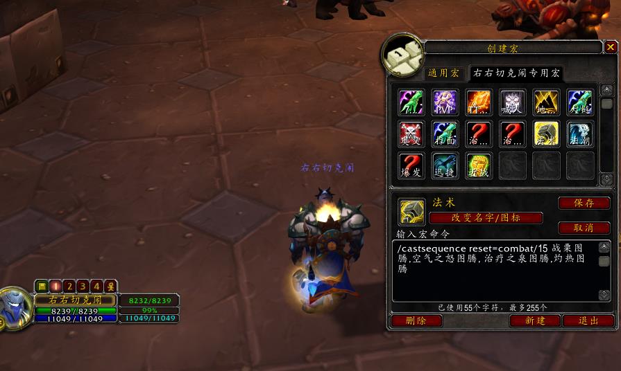 这个宏是所有萨满必备的,可以一键逐次放4个图腾,图腾的名字大家可以自己换成需要的。一般萨满需要至少做3个这样的宏,法系队、近战队和PVP。