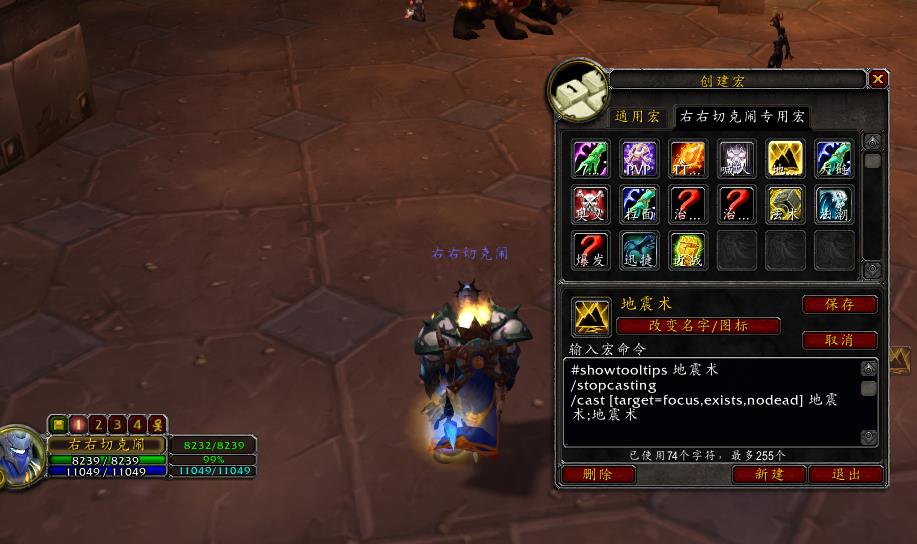 这个宏就很简单了,有些战斗需要奶萨协助打断,给自己需要打断的目标设置一个焦点,然后用这个宏就会打断当前所有施法,对焦点目标使用地震术,非常的好用。