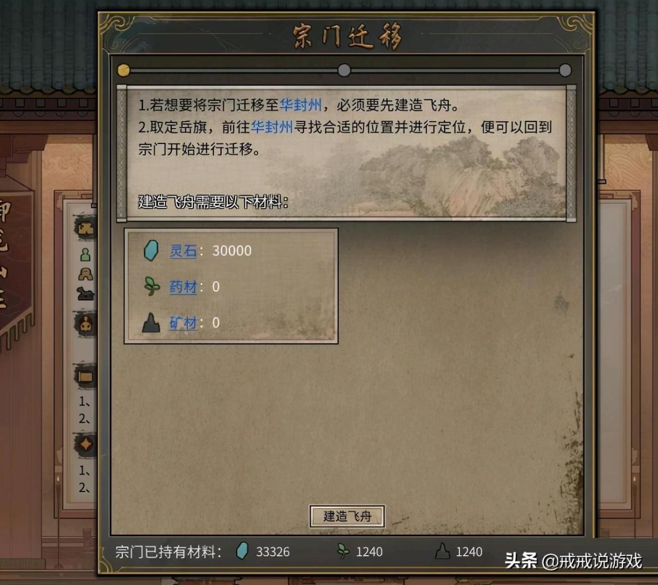 随着宗门的强大,小小永宁州已经满足不了我们了,是时候把宗门搬迁到华封州了,想要搬迁就需要先建造飞舟,建造需要3W灵石,小伙伴们可以提早准备好。如果刚搬迁后的宗门害怕被人攻击的话,可以考虑先闭关,然后选址方面尽量里城镇近一些,这样也方面自己传送。