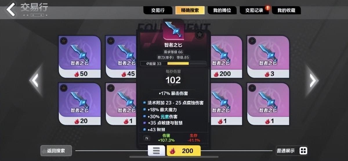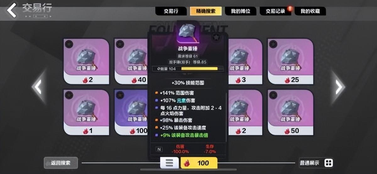 我们拿到这装备开始搜索,拍卖行前三页都没有卖的特别贵的装备,同时看到第三页有个100火的,点开看到有3个t1属性说明这装备至少是别人做了淘汰下来的,由此可确定该装备并没有太大的价值,直接分解或者摧毁。