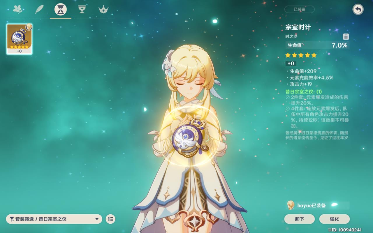 圣遗物:同样是宗室4件套,4绝缘也能用。推荐充能沙,雷伤杯,双暴头;副属性优先级推荐充能>双暴>攻击。