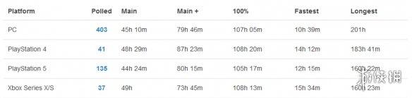 此外,从HowLongtoBeat统计的平台数据中可以看出,PC平台与PS5平台的玩家通关速度较快,比PS4以及XboxSeriesX/S快了4小时左右。