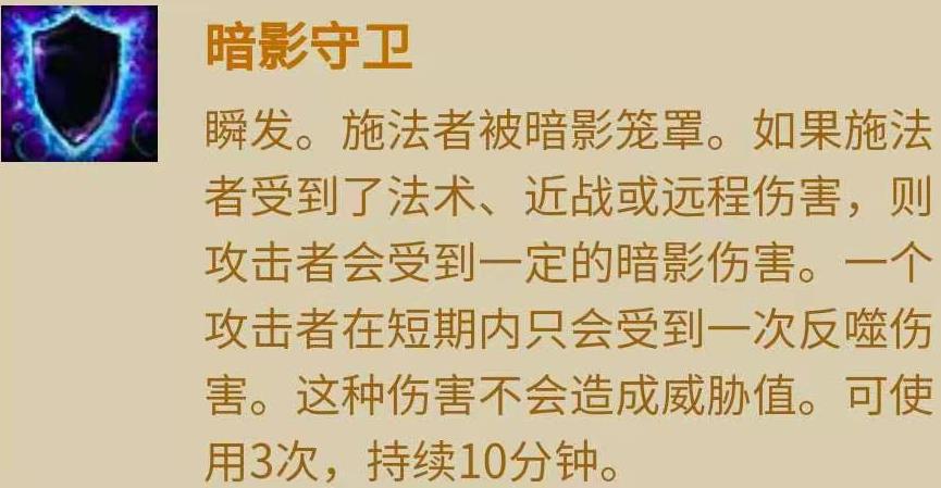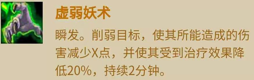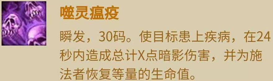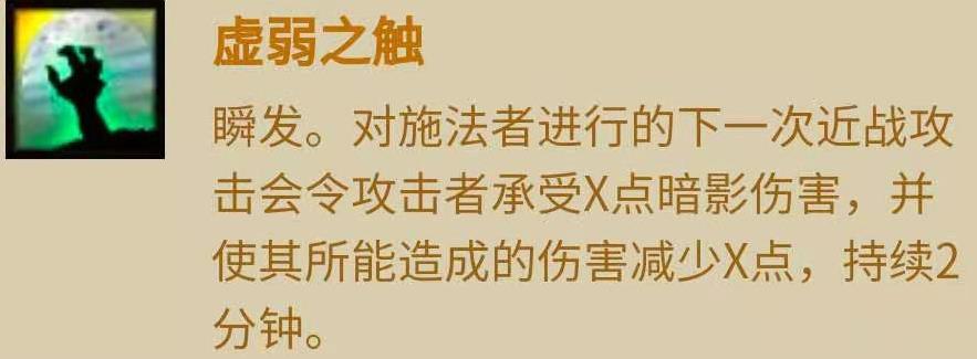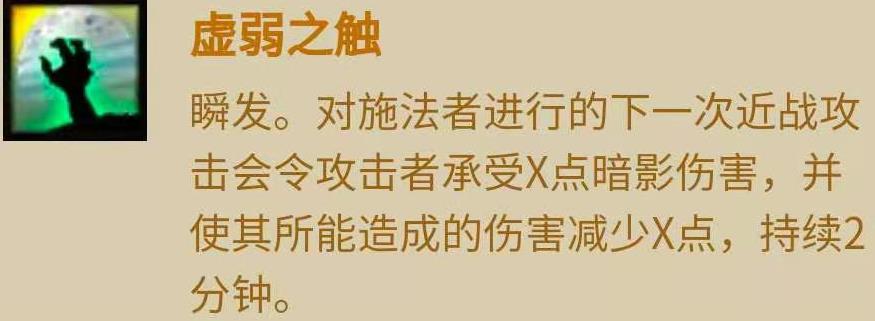亡灵牧师特有噬灵瘟疫是一个不错的输出技能,伤害比痛还高一些,关键是还回血,几乎所有的亡灵牧师都做了噬灵+痛的一键宏,非常不错的PVP技能。虚弱之触同血精灵一样,种族特殊技能虚弱之触对攻击你的目标造成80点近战伤害,并在后续120s内降低35点伤害,持续2分钟:战斗前释放,被近战攻击时候触发,恐惧后噬灵+痛的一键宏,因为是DOT伤害,不打断恐惧效果,回血以及3DOT造成可观的伤害很是无赖。