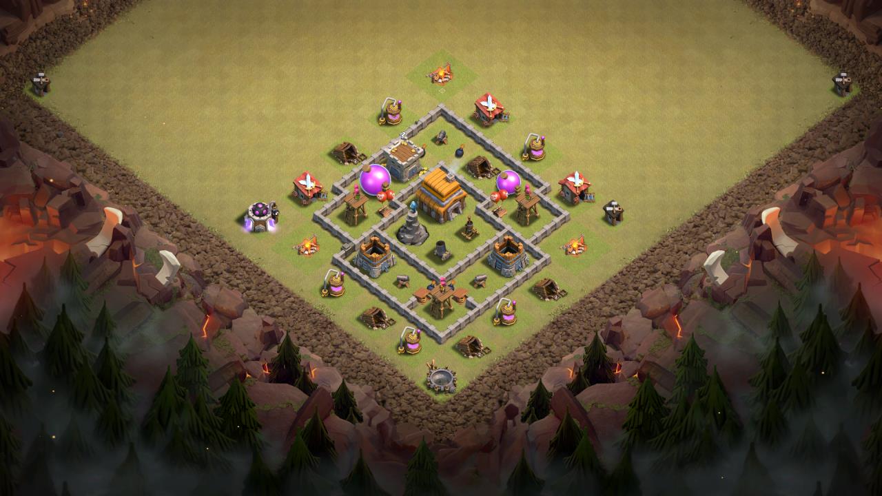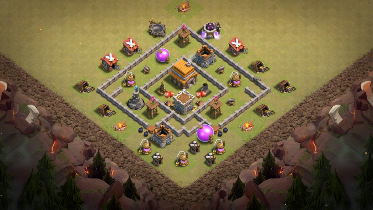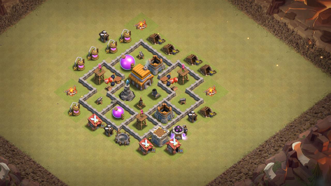 4本以前没有没有开放阵型链接的功能,所以大家进入游戏,先直接把大本营升到4级就行,其他的啥也不用管。4本也不用停留太久,把罐子升一升就直接升5本吧,所以4本阵型只推荐了一个,帮大家守资源用。