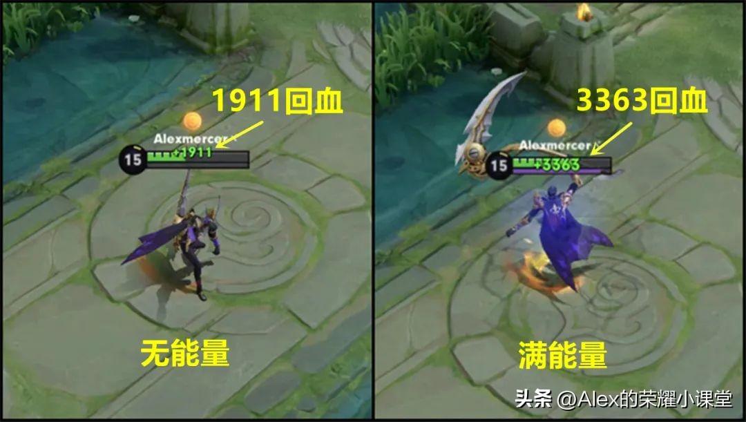 右图:白起满能量时,使用治疗回复3363点血量,如果出不死鸟之眼的话差距还会更大。