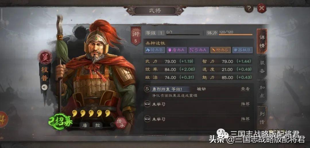 三国志战略版程普这个武将看起来兵种适性方面比较一般,身板属性也没太大的亮点,可凭借着自带战法的特殊性,硬生生的成为了平民和大佬都非常喜欢使用的神将。游戏中为数不多的顶配战法,抚辑军民和草船借箭这两大神技的使用率方面,程普绝对的排第一的,可以说牌面十足!