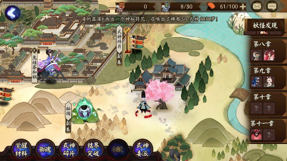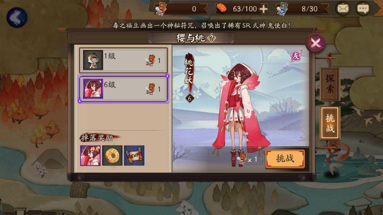 探索副本第八章会发现妖怪桃花妖,使用式神挑战券可以发起挑战得到桃花妖碎片。如果运气好就可以触发式神碎片本,也就是我们的主要碎片来源!